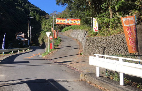 看板左折後、直進約150mで水輪フィッシングセンターに到着します。- 看板左折後、右側坂道を登るとみかん狩り見晴園があります。