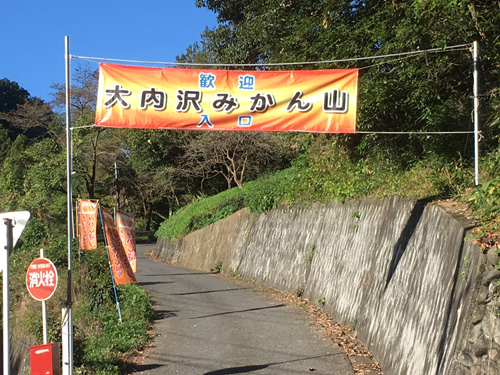 看板左折後、直進約150mで水輪フィッシングセンターに到着します。- 看板左折後、右側坂道を登るとみかん狩り見晴園があります。